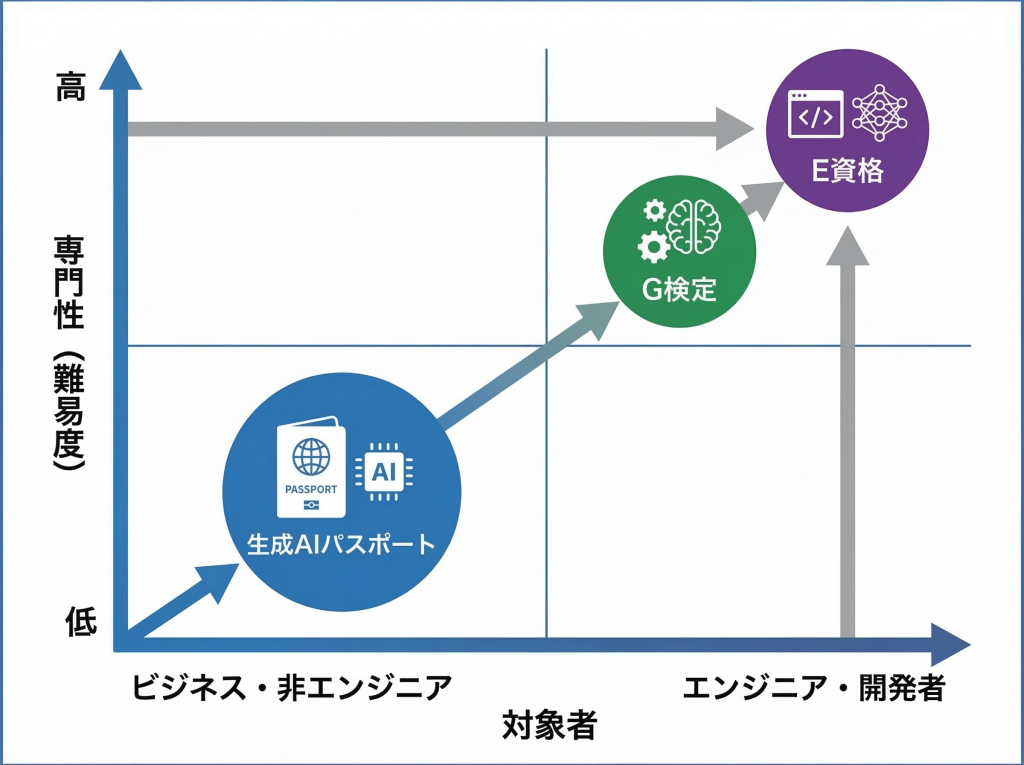 G検定やE資格など、AI関連の資格は理系やエンジニア向けの難しいものが多いのが実情です。その点、生成AIパスポートは文系職種(営業、事務、企画など)や学生でも挑戦しやすい難易度に設定されており、AI学習の挫折を防ぐ最初の目標として最適です。