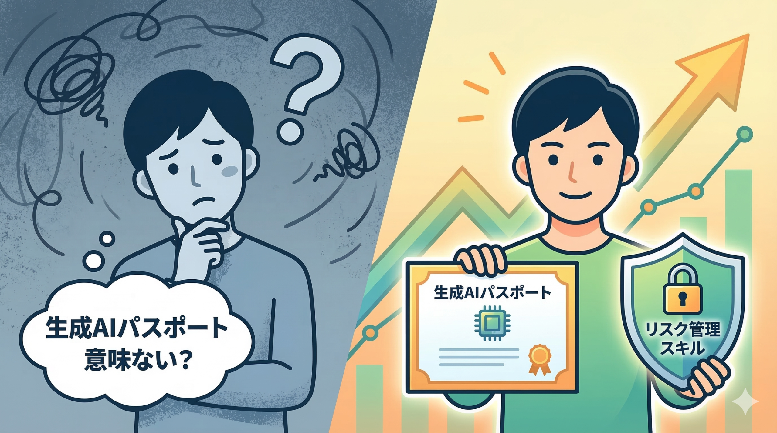 「生成AIパスポートを取ろうか迷っているけど、ネットで『意味ない』って見かけて不安…」 「せっかく勉強しても、就職や転職で評価されなかったらどうしよう?」