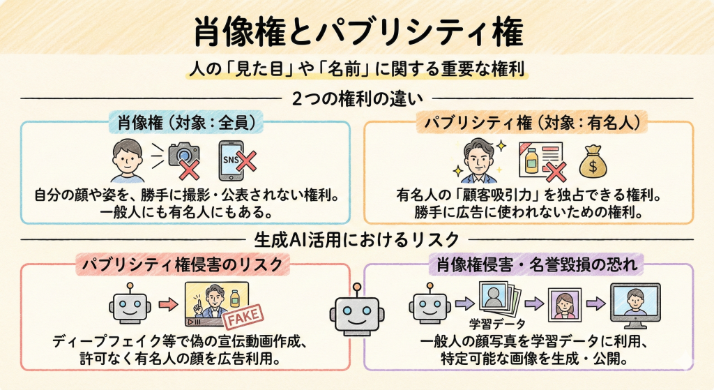 - パブリシティ権:有名人のそっくりさんをAIで作って勝手に広告に使うのはNG。