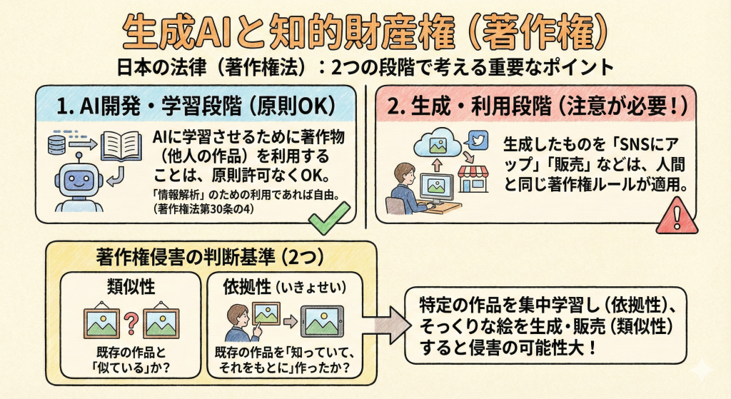 日本の法律(著作権法)では、生成AIと著作権の関係を「AIが学習する段階」と「生成したものを利用する段階」の2つに分けて考える必要があります。これが非常に重要なポイントです。