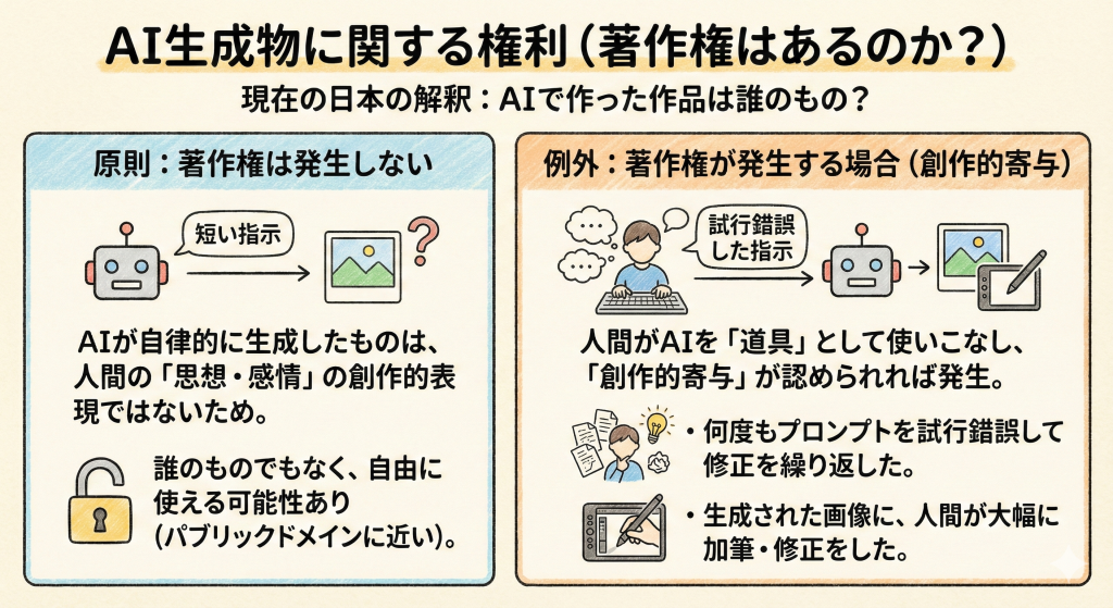 - AI生成物の権利:「AIが勝手に作ったもの」に著作権はない。「人間が道具として使いこなし、創作的に関与したもの」には発生する可能性がある。