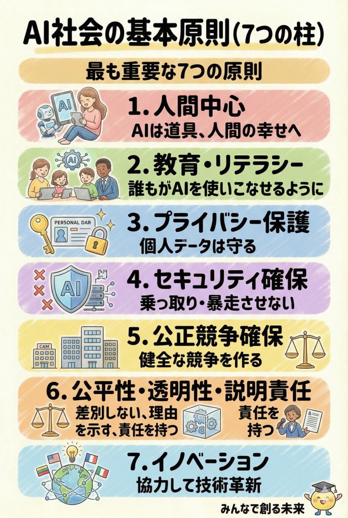 - 教育・リテラシー:誰もがAIを使いこなせるよう、教育の機会を提供すること。