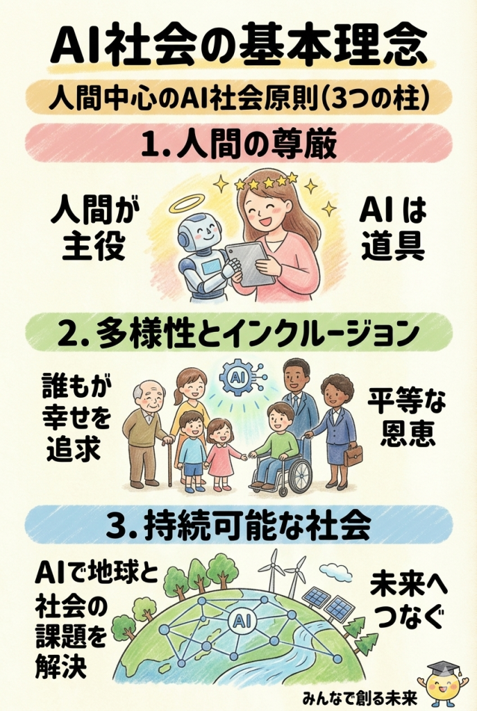 - 人間の尊厳が尊重される社会(Dignity):AIはあくまで人間のための道具です。人間がAIに支配されたり、AIによって人間の尊厳が傷つけられたりしてはいけません。「人間が主役」という大前提です。