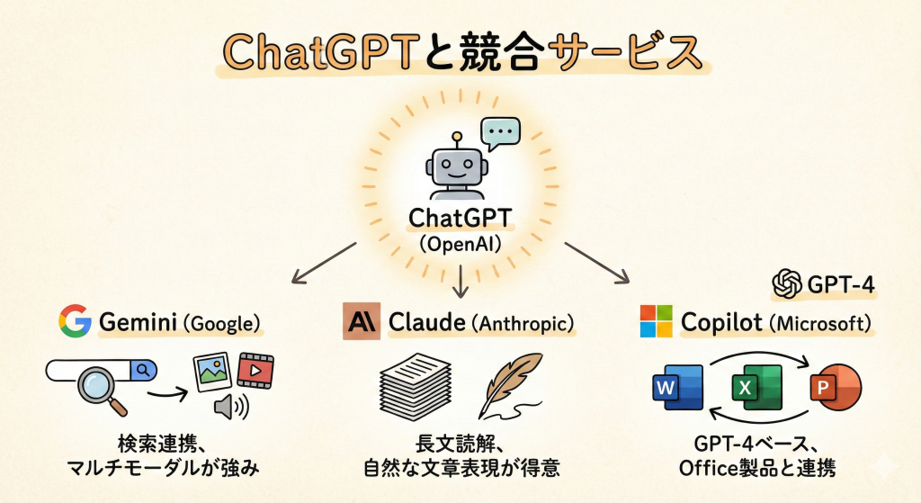 - Copilot(コパイロット):Microsoftが提供。内部でGPT-4などのOpenAIモデルをベースにしており、WordやExcel、TeamsなどのOffice製品に組み込まれて連携できるのが最大の特徴。