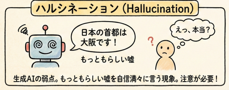 生成AIの最大の弱点がハルシネーション(幻覚)です。これは、AIが「もっともらしい嘘」を自信満々に答えてしまう現象のことです。