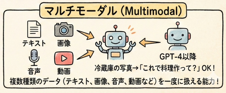 マルチモーダルとは、テキスト(文字)だけでなく、画像、音声、動画など、複数の種類のデータを一度に扱える能力のことです。