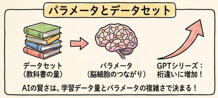 パラメータは「脳のシナプスの数」に例えられ、GPT-3の「1750億」から、GPT-4では「数兆規模(非公開)」に達していると推測されており、これが知能の劇的なジャンプを生み出しました。