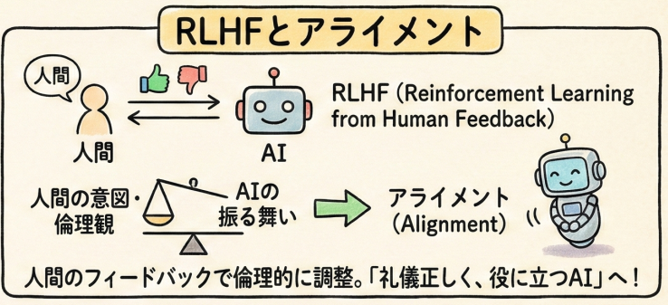 - アライメント(Alignment):AIの振る舞いを、人間の意図や倫理観(役に立つか、無害か、正直か)に合わせること。