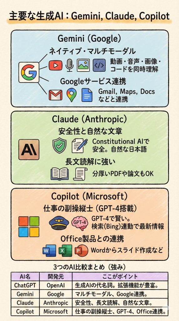 この記事では、ChatGPTの強力なライバルであるGemini(Google)、Claude(Anthropic)、Copilot(Microsoft)の3大サービスについて、その特徴と選び方をわかりやすく解説します。