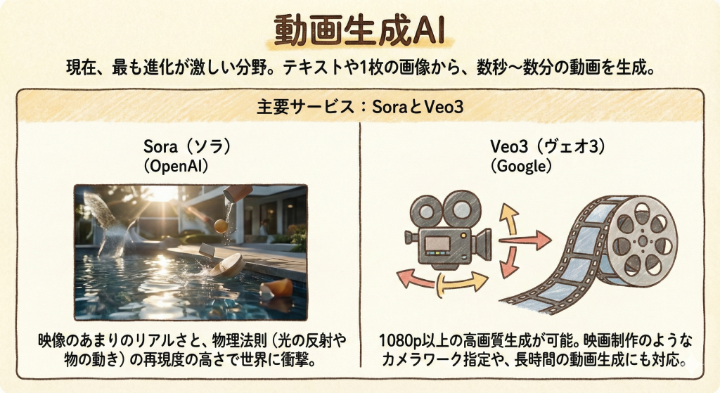 現在、最も進化が激しい分野です。テキストや1枚の画像から、数秒〜数分の動画を生成します。