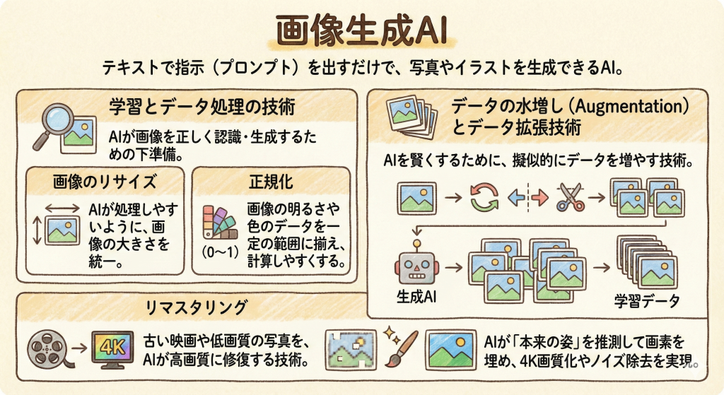 • 画像:リサイズや正規化などの前処理が重要。AIでデータを水増し(拡張)することも可能。リマスタリングで高画質化もできる。