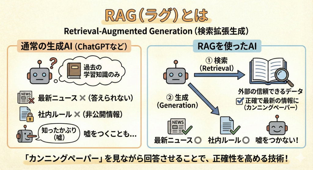 簡単に言うと、「AIにカンニングペーパー(外部の信頼できるデータ)を持たせて、それを見ながら回答させる技術」のことです。