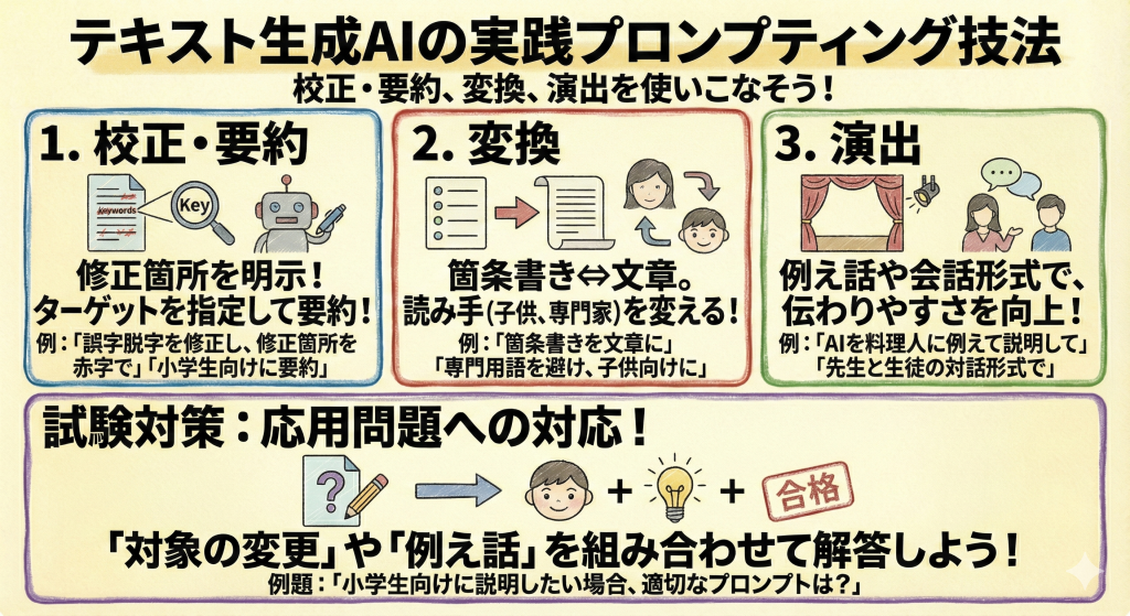試験では、「小学生向けに説明したい場合、どのようなプロンプトが適切か?」といった応用問題が出題されます。「対象の変更」や「例え話」といったテクニックを組み合わせて解答できるようにしておきましょう!