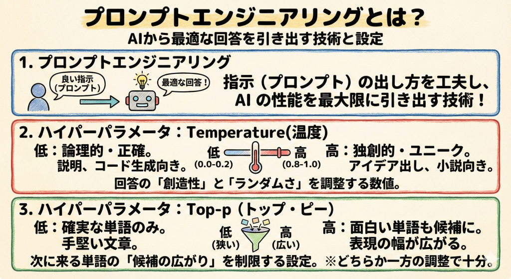 プロンプトエンジニアリングには、言葉選びだけでなく、AIの「性格」を決める数値設定(ハイパーパラメータ)の調整も含まれます。