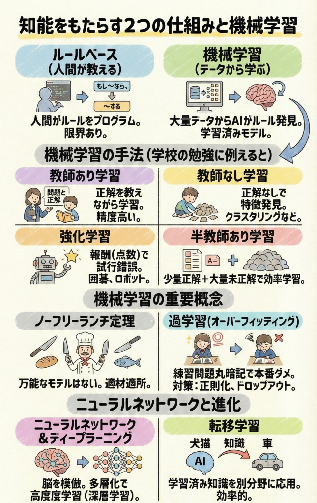 - AIには人間がルールをすべて書く「ルールベース」と、データから自ら学ぶ「機械学習」がある。