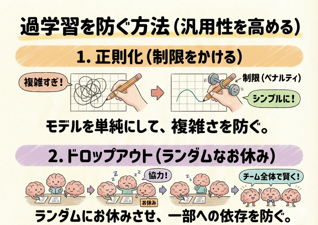 - 正則化:モデルが複雑になりすぎないように、あえて数式に制限(ペナルティ)をかける方法。「難しく考えすぎず、シンプルに考えなさい」と指示を出すイメージです。