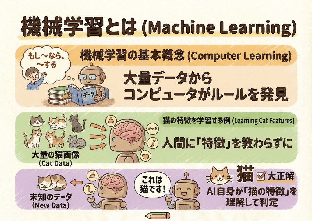 人間がいちいち「猫の耳は三角で、ヒゲが3本あって…」とルールを書かなくても、AIに何万枚もの「猫の画像」と「猫以外の画像」を見せることで、AI自身が「猫とはこういうものだ」という特徴を自ら学習します。