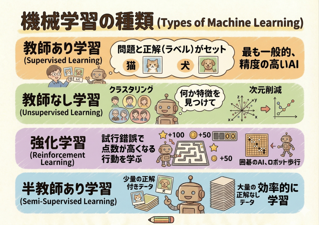- 機械学習には「教師あり」「教師なし」「強化学習」などの手法があり、目的に応じて使い分ける。