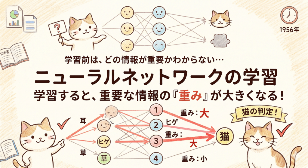 最終的に、この無数の「重み」のバランスが最適化されることで、AIは「これは猫だ」と正しく認識できるようになるのです。