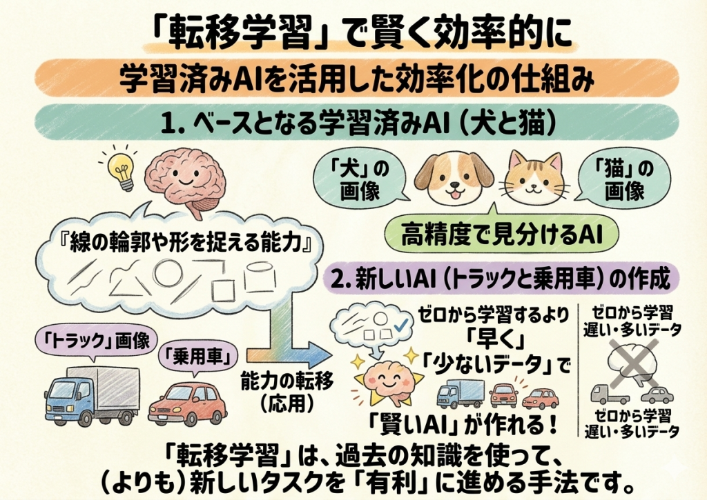 - 学習済みの知識を別のタスクに活かす「転移学習」で効率よくAIを開発できる。