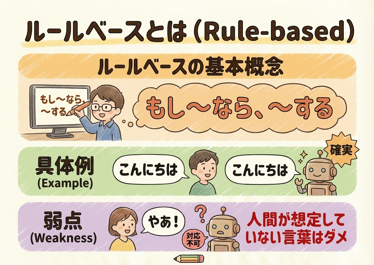 ルールベースとは、「もしAなら、Bをする(IF-THENルール)」という規則を、人間が手作業でプログラムする方法です。